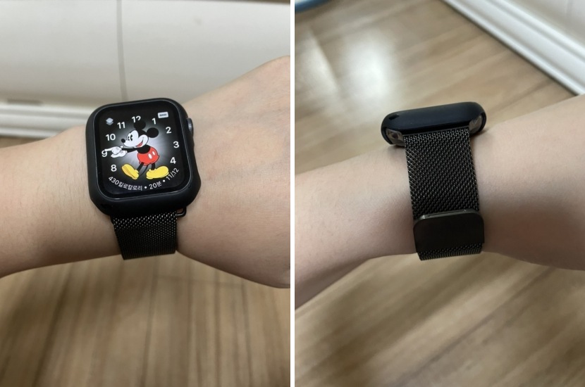 전체적으로 스트랩이 애플워치에서 튀어나오지도 않고 딱 맞고, 편하게 잘 쓸 수 있을 것 같다! 다만 밀레니얼 루프 특성인지 니트 입을 땐 좀 조심해야 한다. 니트 소매가 뜯어질 수 있기 때문에.
