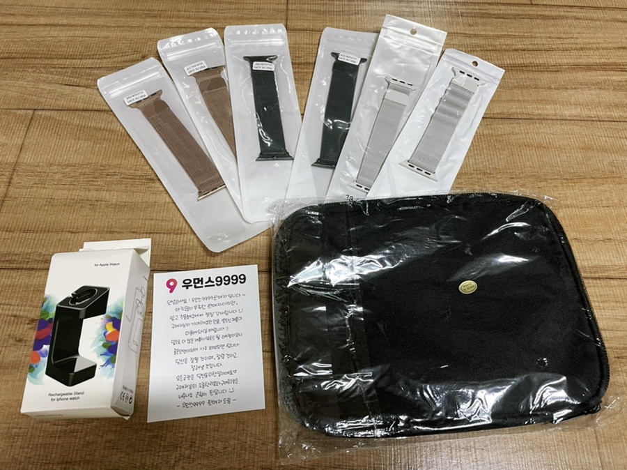 그런데 지금 찾아보니 내가 구입했을 때보다 애플워치 거치대가 좀 더 잘 버틸 수 있는 것으로 주는거 같다. 부럽네...! 나는 스트랩 파우치를 얻을 목적으로 6개 이상을 한 번에 구매했다.